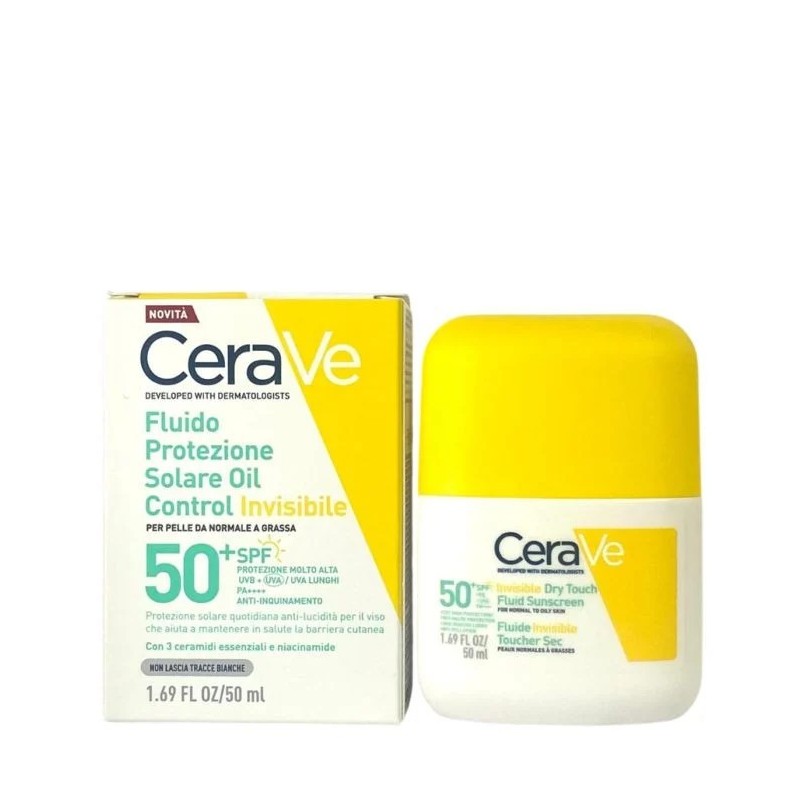 Cerave fluido protector invisible oil control spf50+ es un protector solar facial de uso diario con protección muy alta frente a los rayos uvb, uva y uva largos. Su fórmula ligera ofrece un acabado invisible y ayuda a controlar el exceso de grasa y los brillos en pieles normales a grasas. Ha sido desarrollado con dermatólogos para proteger la piel frente al sol y la contaminación, al mismo tiempo que refuerza la barrera cutánea.