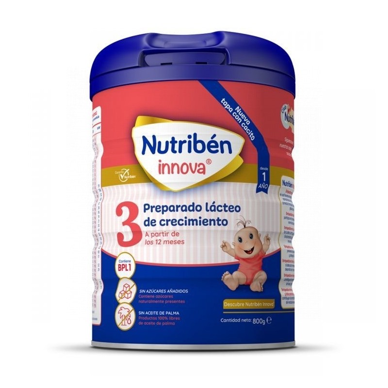 INGREDIENTES Maltodextrina, leche desnatada, rasa láctea, aceites veetales (aceite de nabina, aceite de irasol, y aceite de coco), alactooliosacáridos (5,9%), minerales (fosfato bicálcico, cloruro manésico, hidróxido cálcico, fosfato dipotásico, sulfato ferroso, sulfato de zinc, sulfato de mananeso, sulfato de cobre, yoduro potásico y selenito sódico), cloruro de colina, aroma de vainilla, vitaminas (vitaminas (C, E, niacina, ácido pantoténico, A, riboflavina, tiamina, B6, ácido fólico, K, biotina, D y B12), inositol, taurina, Bifidobacterium lactis (BPL1), emulente (lecitina de irasol), L-carnitina. Puede contener trazas de soja. MODO DE EMPLEO El incumplimiento de las instrucciones de preparación y/o un almacenamiento inadecuado, pueden perjudicar la salud de su bebé. 01. Lávese bien las manos. 02. Lave los utensilios que vaya a necesitar (biberón, tetina, rosca, taza y cuchara). Esterilice el biberón junto con la tetina y la rosca. 03. Hierva aua y déjela enfriar hasta que esté templada, a unos 45°C. Vierta la cantidad adecuada en el biberón o taza. 04. Añadir el número de medidas rasas recomendadas en la tabla de dosificación de Nutribén Innova 3. 05. Si utiliza biberón, ciérrelo y aítelo hasta que el contenido quede totalmente disuelto. Si utiliza una taza, remueva el contenido con una cuchara. 06. Antes de alimentar al niño, compruebe que la leche está a la temperatura adecuada. Consumir inmediatamente después de la preparación del biberón o la taza. No conserve nunca los restos de la toma. CONSERVACIÓN Y CADUCIDAD Consérvese el envase sin abrir en un luar fresco y seco. Una vez abierto, ciérrese bien con la tapa de plástico y consérvese en un luar fresco y seco. Después de abierto, debe usarse en un plazo máximo de un mes. Envasado en atmósfera protectora